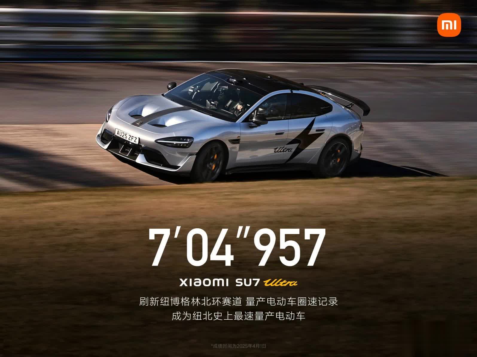 小米SU7 Ultra量产版在挑战德国纽博格林北环赛道过程中取得重大成功,刷新了“纽北最速量产电动车”的圈速纪录。这台小米SU7 Ultra选装了赛道专业套装,以7分04秒957的成绩成为纽北史上最速量产电动车。